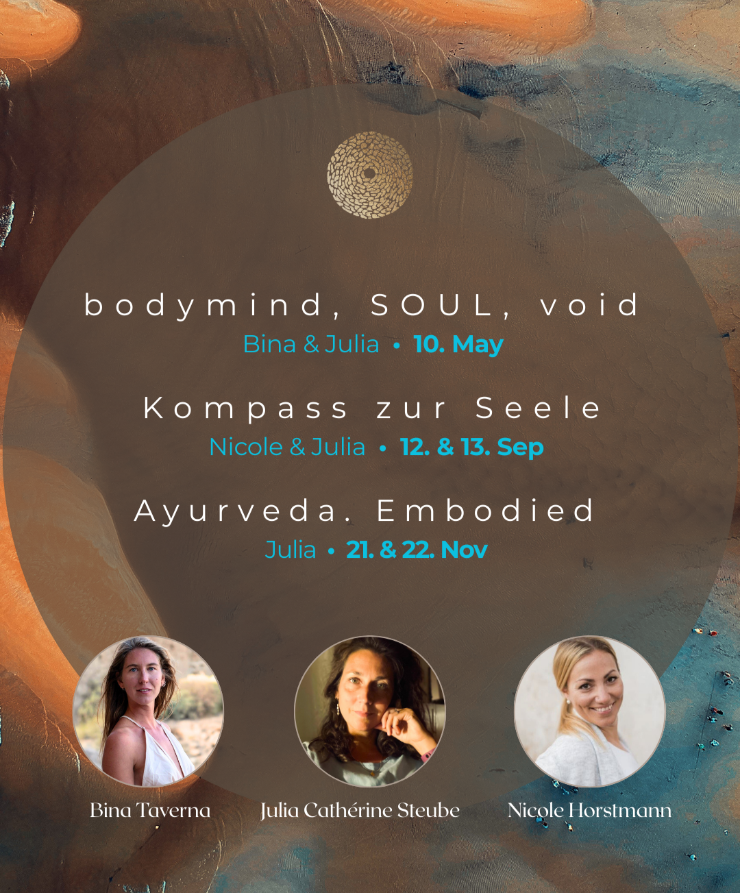 Wir — Bina, Nicole und Julia — freuen uns, dich über Embodiment, Emotionen und Lebendigkeit, mit Tiefe, Präsenz und Stille auf der Reise in deine Innenwelten zu begleiten!